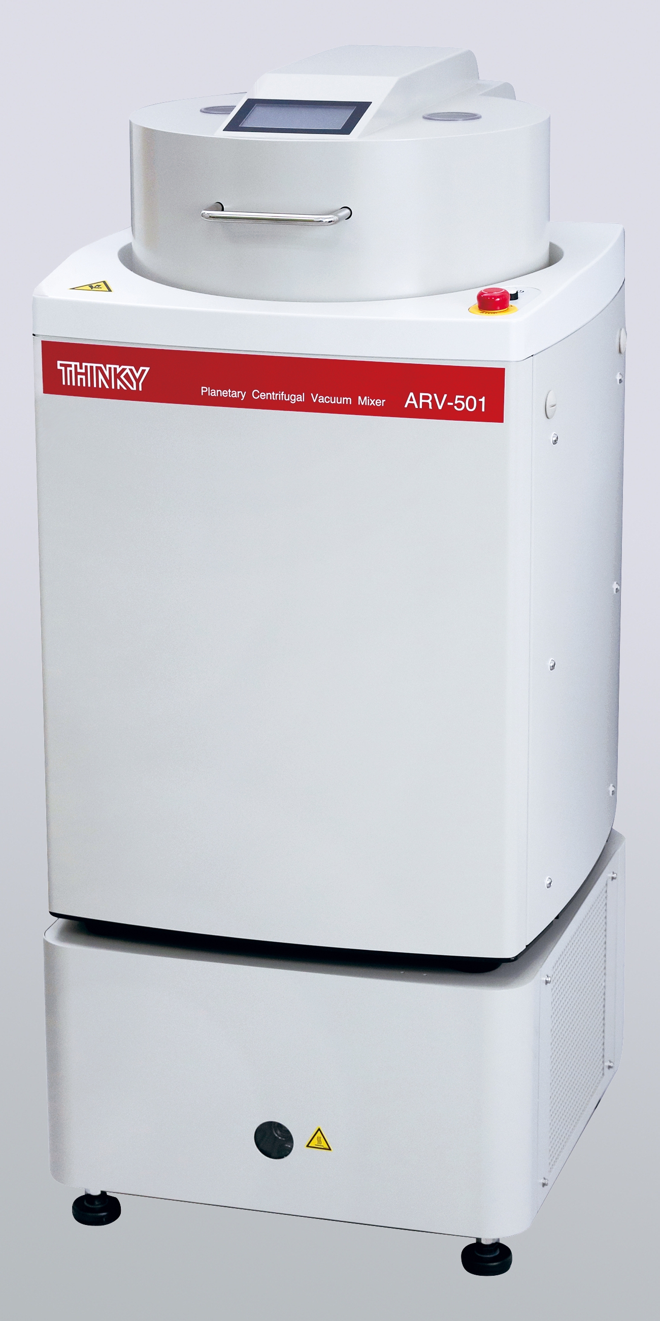 Der ARV-501 ähnelt dem ARE-500 vom Gehäuseaufbau, steht jedoch üblicherweise auf dem optionalen Unterbaugestell, in dem die Vakuumpumpe untergebracht ist. Dadurch ergibt sich einerseits, eine für den Anwender optimierte Bedienhöhe, andererseits ergeben sich durch die Einhausung – wie bei allen Thinky-Vakuummischern – verschiedene weitere Vorteile: